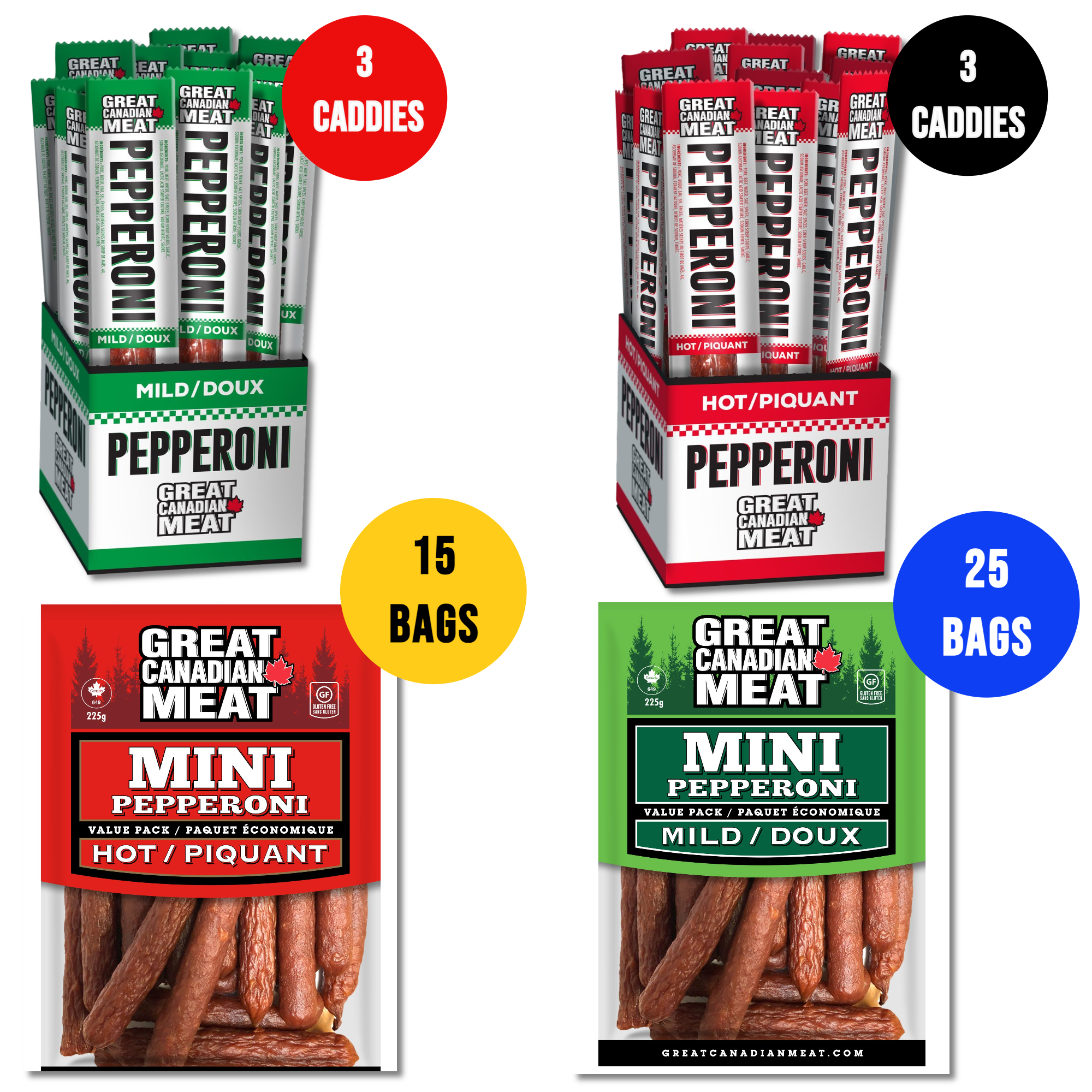 Includes: 3 x Mild 22g Pepperoni Caddies, 3 x Hot 22g Pepperoni Caddies, 25 x Mild Mini Pepperonis 225g, 15 x Hot Mini Pepperonis 225g.