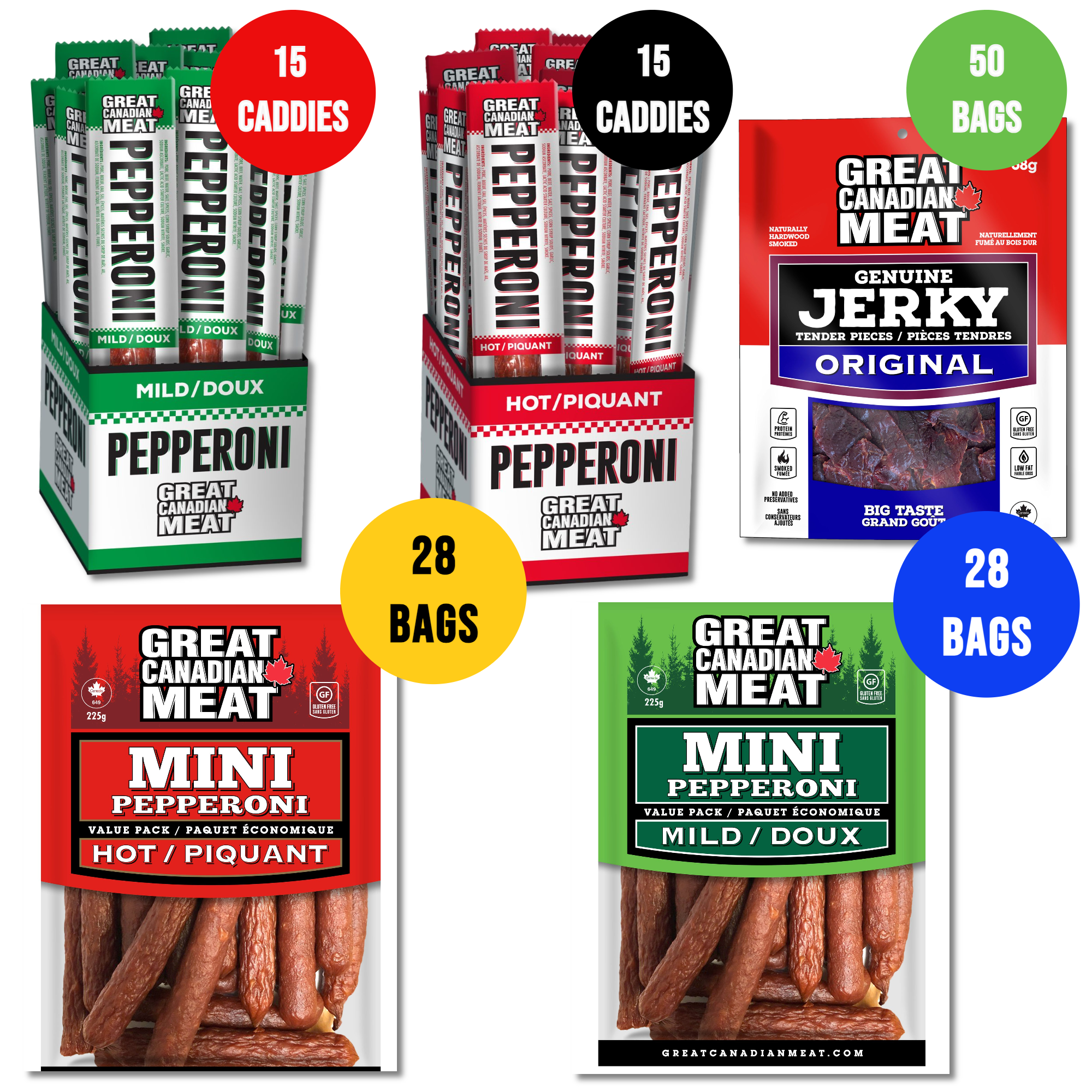 Includes 15 x Mild 22g Pepperoni Caddies, 15 x Hot 22g Pepperoni Caddies, 50 x Original 68g Beef Jerky, 28 x Hot Mini Pepperonis 225g, and 28 x Mild Mini Pepperonis 225g.