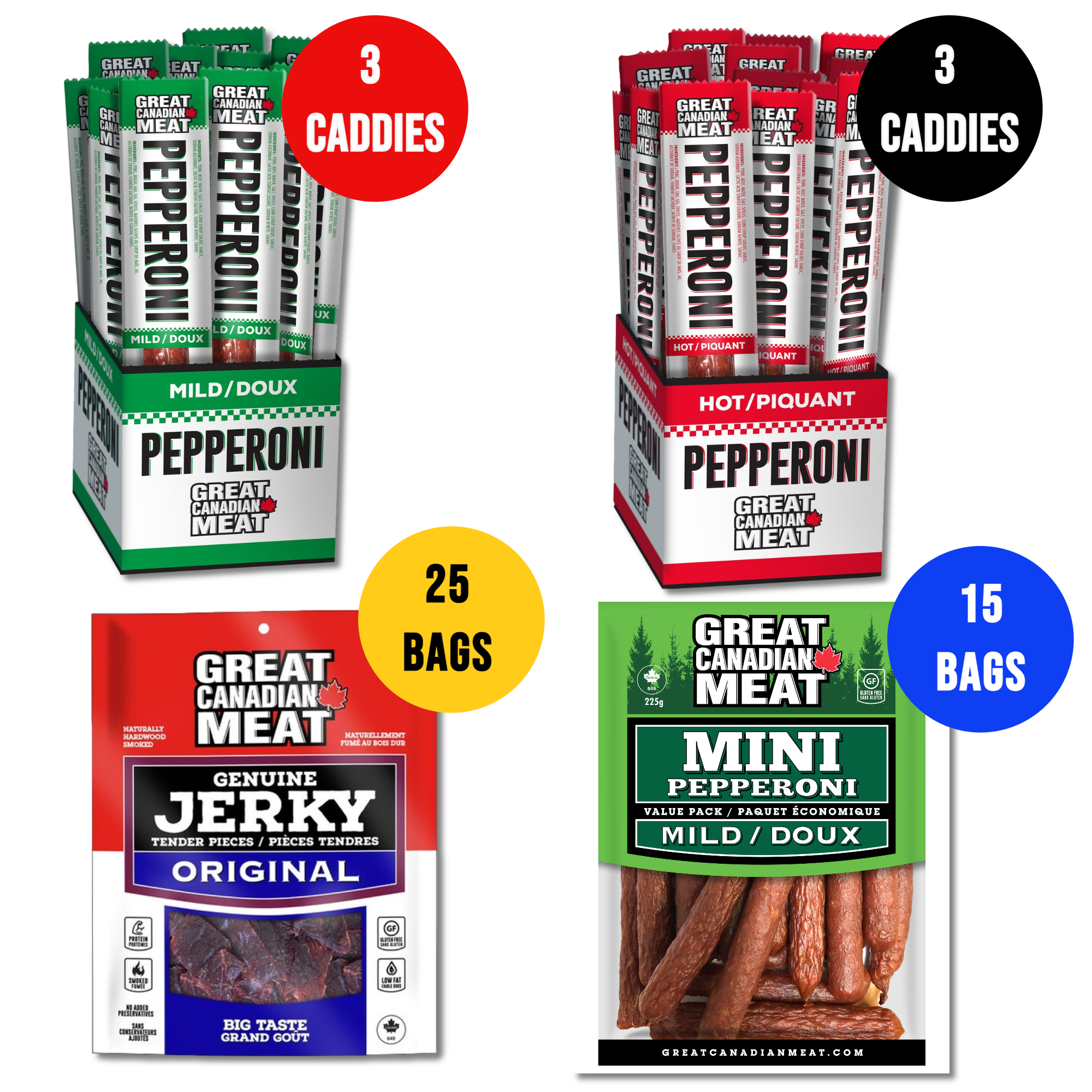 3 x Mild 22g Pepperoni Caddies, 3 x Hot 22g Pepperoni Caddies, 25 x Original 68g Beef Jerky, 15 x Mild Mini Pepperonis 225g.